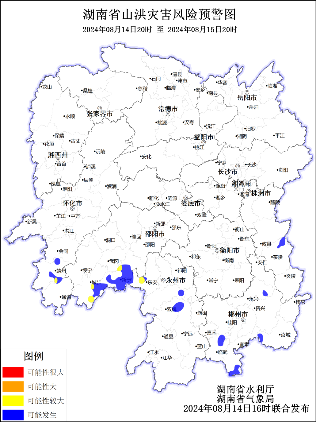 根据省气象局8月14日预报,省水利厅与省气象局联合会商得出如下结论:受降雨影响,14日20:00至15日20:00,郴州市、永州市、株洲市、邵阳市、怀化市等5市有发生山洪灾害的风险,具体如下:黄色预警区域:新宁县西北部、城步县东南部,东安县西南部,靖州县东南部、通道县西北部。