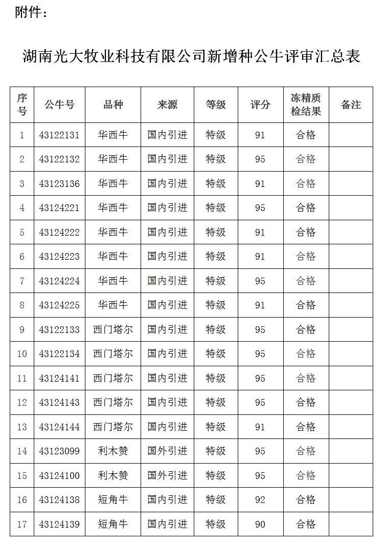 各有关单位:根据湖南光大牧业科技有限公司申请,依据《中华人民共和国畜牧法》《种畜禽生产经营许可管理办法》等有关规定,12月15日,我厅组织专家,对该公司申报的新增17头种公牛进行了现场评定,17头种公牛均评定为特级标准,评定新增种公牛提供了农业农村部牛冷冻精液质量检验测试中心(南京)的检测合格报告,...