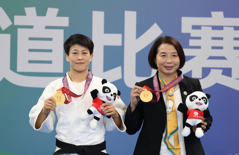 9月16日,冠军湖南队选手伍阳英及教练熊建宏在颁奖仪式上。 陈杰摄9月16日,在小将刘亭拿下女子柔道48公斤级冠军后,湖南队老将伍阳英也紧随其后的拿下第十四届全国运动会柔道女子52公斤级冠军。首战,用时仅2分46秒,伍阳英以一本的方式战胜了云南选手刘应薇,随后在四分之一决赛,伍阳英通过技术...