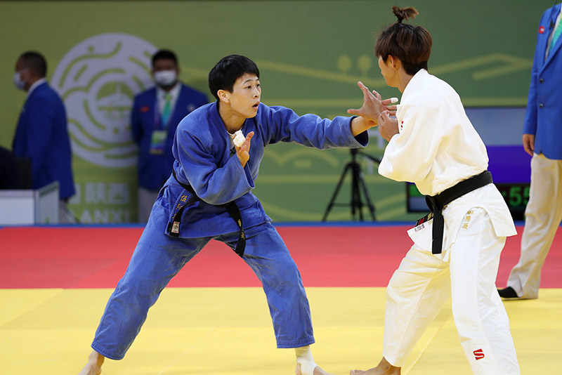 11月10日,湖南队选手伍阳英(右)与香港队选手徐淑琪在女子52公斤级1/16决赛中。最终,伍阳英获胜,晋级下一轮。新华社记者朱祥摄11月10日,第十五届全国运动会柔道项目女子52公斤级金牌赛和铜牌赛在肇庆举行。最终,湖南队选手伍阳英在女子52公斤级金牌赛中不敌江苏队选手姚雨虹获得银牌。