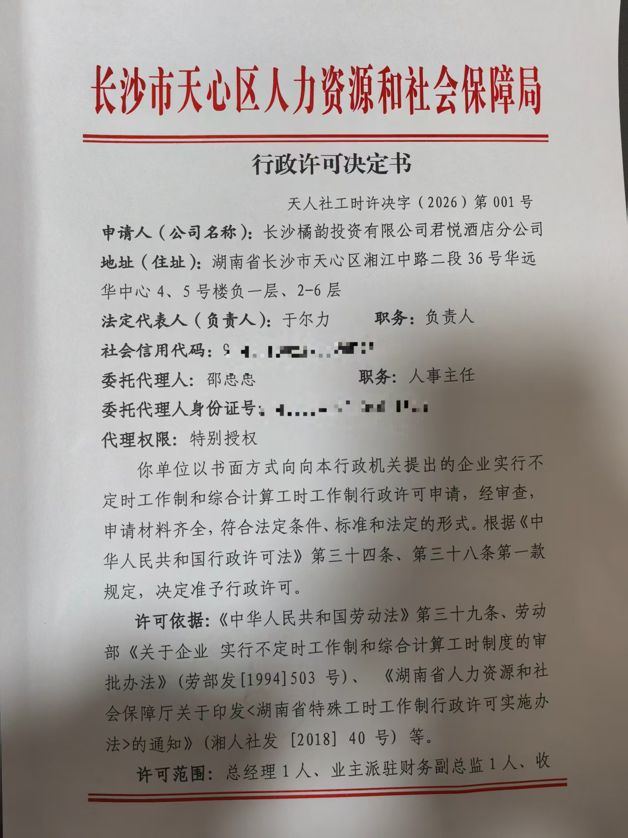 经长沙市天心区人力资源和社会保障局审核,长沙橘韵投资有限公司君悦酒店分公司符合申报符合特殊工时工作制行政许可条件,现予以公示(详见附件)。长沙市天心区人力资源和社会保障局2026年1月30日