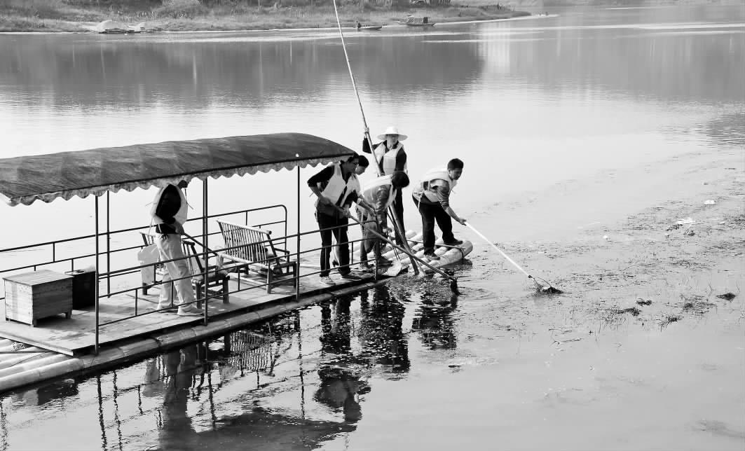 10月23日,新宁县环保志愿者们撑着竹筏在县城夫夷江犁头湾河段义务捡拾垃圾。为保护夫夷江母亲河生态环境,近年来,该县许多干部职工自觉加入到环保志愿者队伍当中,如今,县环保志愿者队伍已发展到近200人。