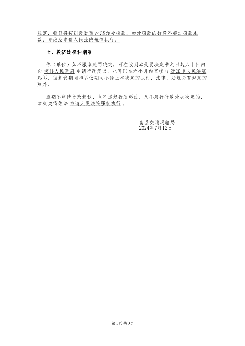 如不服本行政处罚决定,可在接到处罚决定书之日起60日内向南县人民政府或者益阳市水务局申请行政复议或者6个月内直接向南县人民法院起诉。行政复议和行政诉讼期间,不停止本行政处罚决定的执行。逾期不申请行政复议或者不向人民法院起诉又不履行行政处罚决定的,我局将依法申请人民法院强制执行。