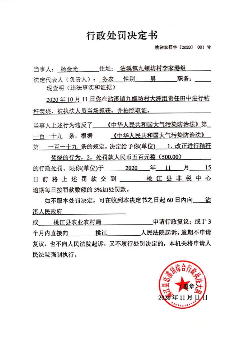 行政处罚决定书桃三农(渔政)决〔2023〕7号当事人姓名:杜*性别:男当事人违反禁渔区、禁渔期规定进行捕捞案,现已查明:当事人于2023年6月25日在湖南省桃江县三堂街镇白竹洲禁区资江河段进行捕捞,19时17分当事人被桃江县三堂街镇综合行政执法大队执法人员现场查获。执法人员向当事人出示了行政执法证件...