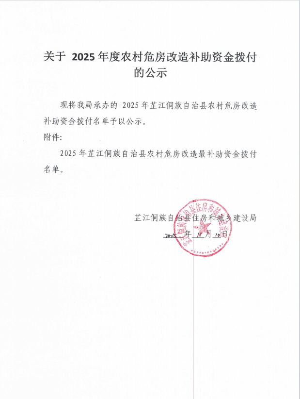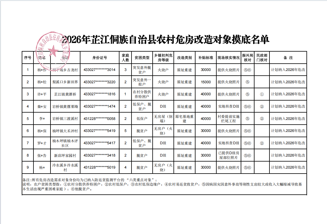 经麻阳苗族自治县危房改造工作领导小组研究同意,决定在全县范围内对麻阳县2025年第二批危房改造补助资金拟拨付名单进行公示,现将名单公示如下:序号区、县乡、镇村民委员会姓名身份证号改造方式发放金额(元)1麻阳苗族自治县尧市镇高洲坪村刘光英43302519******6322新建367802麻阳苗族自治...