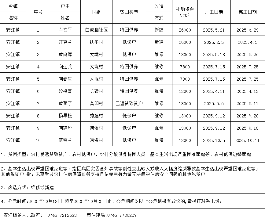 序号乡镇村委会姓名保障对象类型c/d级或无房户改造方式补助资金1黔城镇桃源村周宏连农村分散特困供养人员d级拆除新建260002黔城镇大马村邱安党农村低保户d级拆除新建260003黔城镇小江村向青玲农村低保户c级修缮加固130004黔城镇双溪口村邱成农村分散特困供养人员d级异地新建260005黔城镇红...