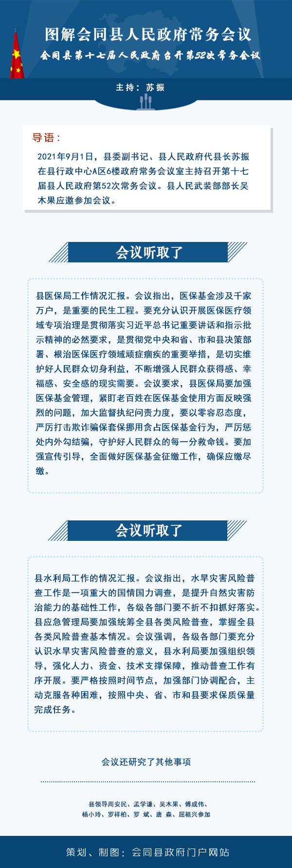 会同县第十八届人民政府召开第52次常务会议 2024年6月27日县委副书记、县人民政府县长苏振在县应急指挥中心主持召开第十八届县人民政府第52次常务会议。会议听取了县应急管理局工作情况汇报。会议强调,各级各部门要深刻学习领会习近平总书记关于防汛抗灾工作的重要指示精神,按照省、市防汛抗灾工作...