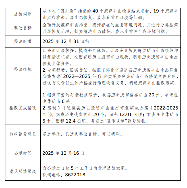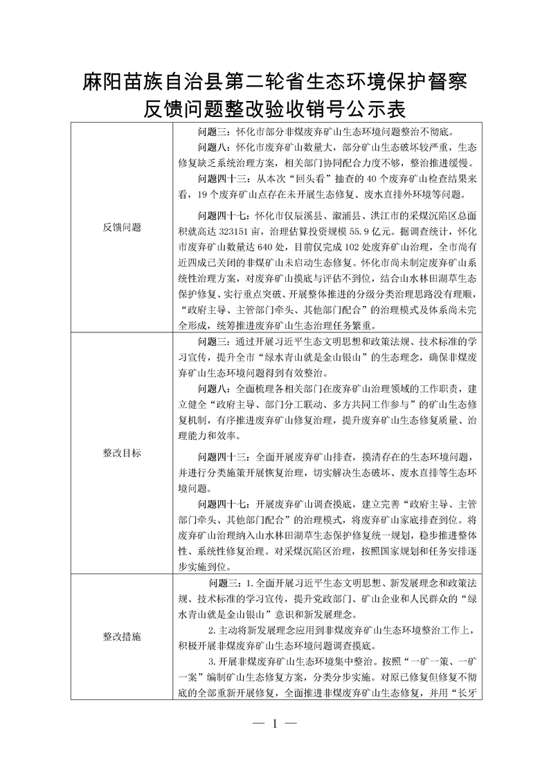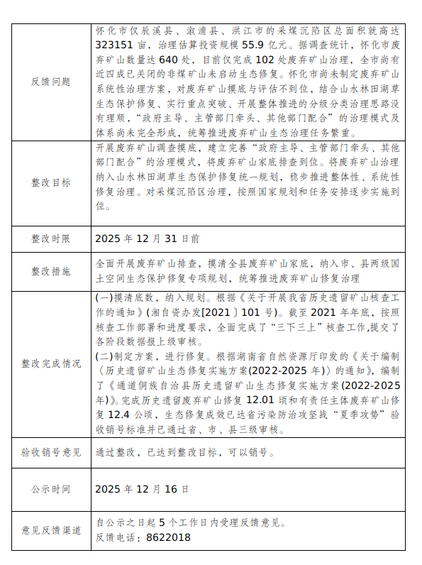 2024年第二轮省级生态环境保护督察报告整改问题整改验收销号公示表反馈问题生态优先绿色发展理念树得不够牢固,“等靠”思想还存在。一些地方和部门过度强调客观条件,存在观望心理、懈怠行为,导致工作进展缓慢。如按照怀化市工作部署,2025年全市垃圾资源化利用率应不低于60%。督察发现,2023年全市垃圾资...