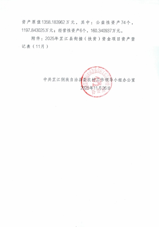 我县于2025年11月份进行了2025年项目资产确权登记工作,经县委农村工作领导小组研究审定后以芷农办﹝2025﹞39号进行了批复,并于2025年11月26日进行了公示。为进一步规范和加强我县项目资产后续管理,确保资产长期发挥效益,现将全县2025年11月项目资产台账情况予以长期公告(详见附件),如...