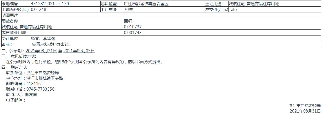按照《土地管理法》《城市房地产管理法》《招标拍卖挂牌出让国有土地使用权规定》和《招标拍卖挂牌出让国有土地使用权规范》等有关法律法规,遵循公开、公正、公平的原则。我局拟以协议方式出让 1 宗国有土地使用权。现将有关情况公示如下:一、地块的基本情况:宗地编号: 431281...