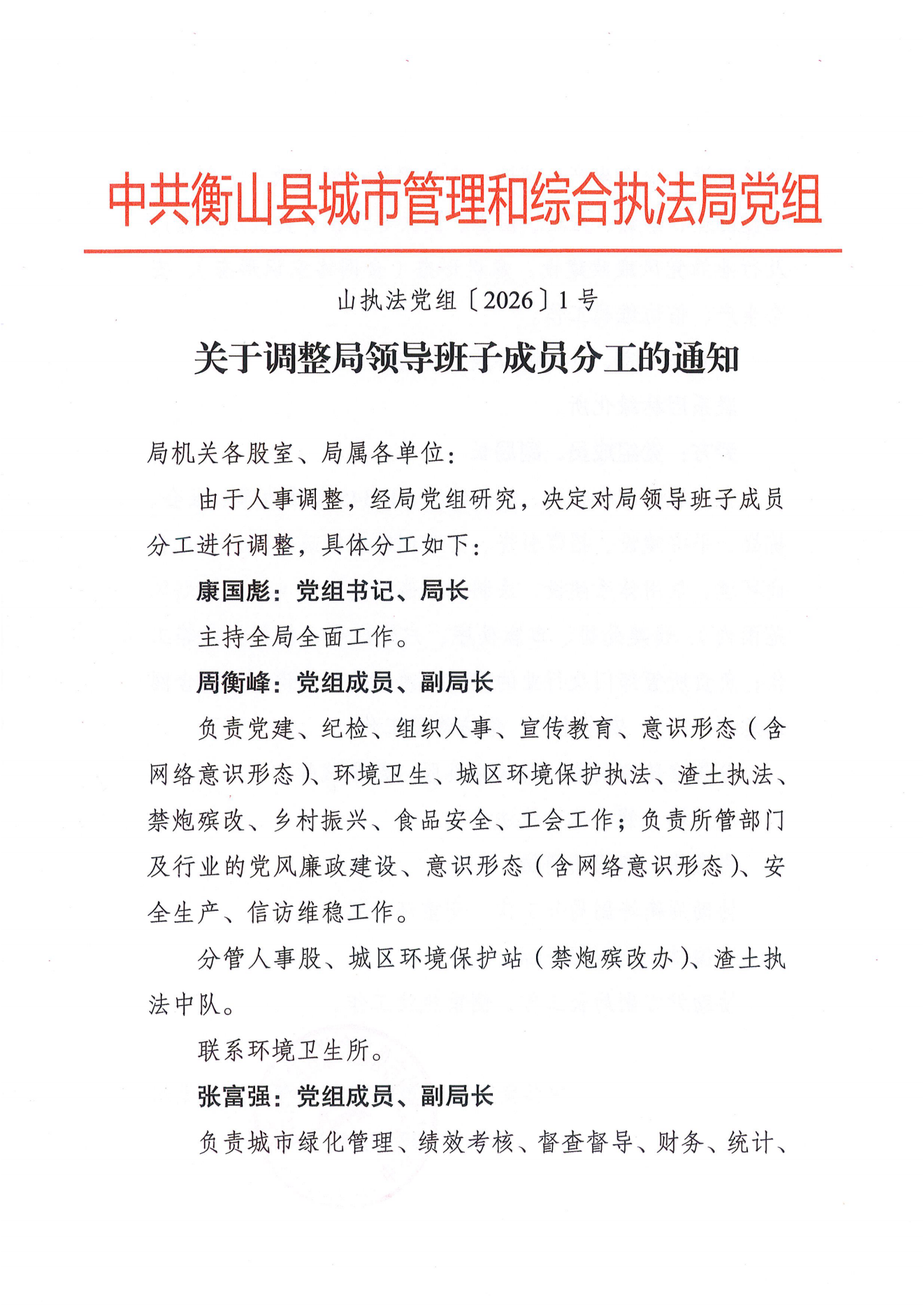 关于调整领导班子分工的通知因人事变动,现将领导班子成员分工如下:党组书记、主任陈铭主持全面工作。党组成员、副主任尹爱华负责工作:基层组织,政工人事,党建,绩效管理。联系纪检监察、党风廉政建设;分管动物疫病防控,动物血防,农业血防项目建设,质量安全检测检验。负责科教培训、科技服务、科技特派员管理,行业...