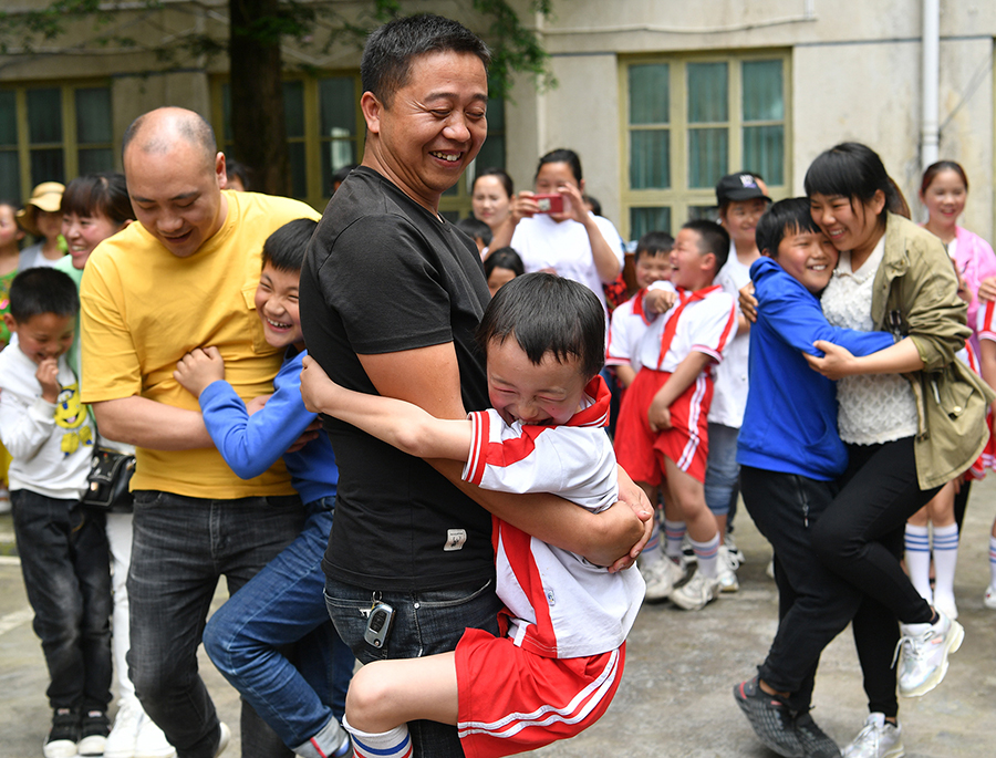 5月31日,花垣县花垣镇团结小学,孩子和家长一起玩趣味踩纸等游戏,欢乐开怀。龙恩泽摄