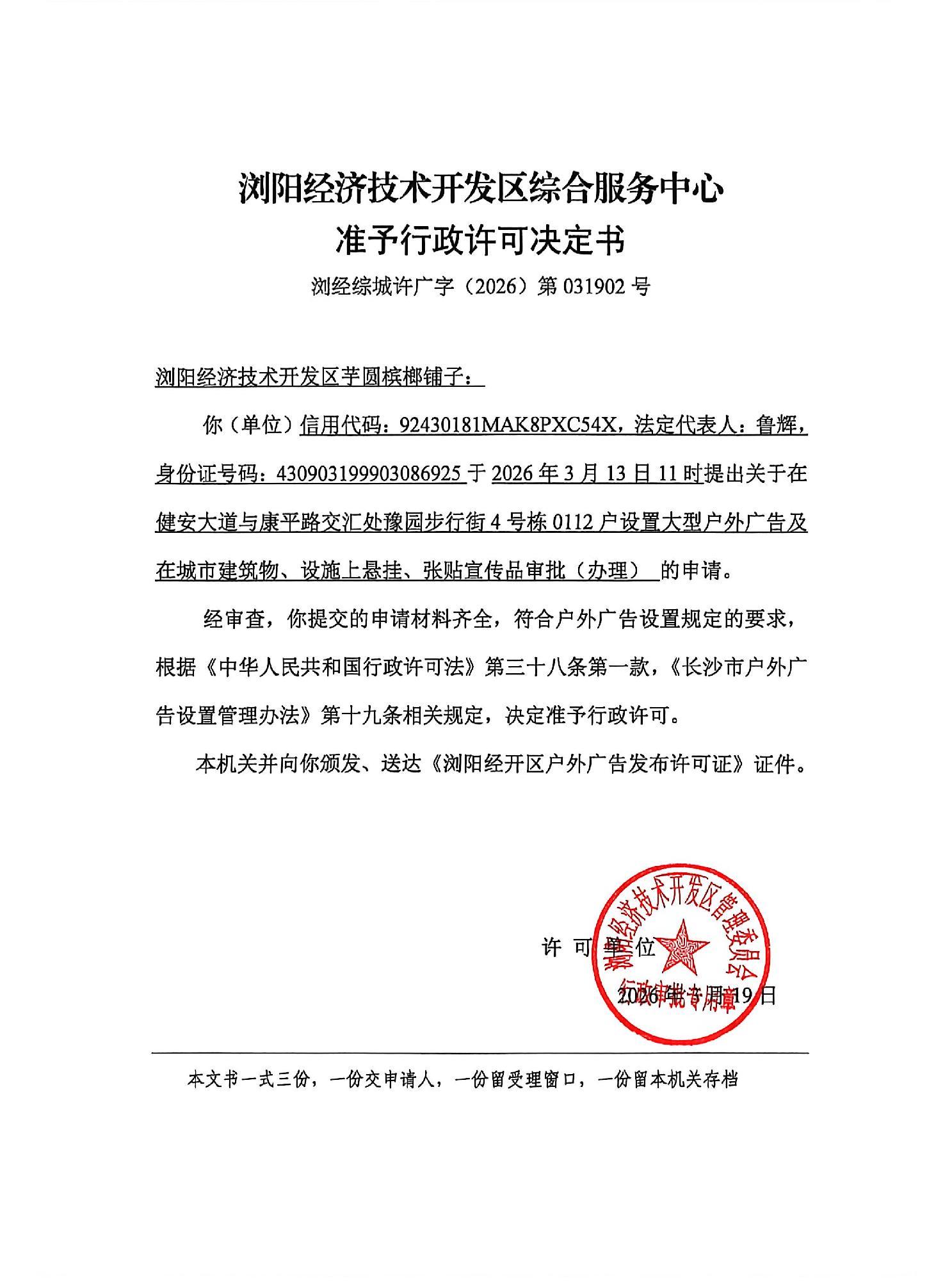 为保障消费者权益,依据《公共场所卫生管理条例实施细则》要求,现将公共场所许可相关信息公示如下:1. 单位名称:浏阳经济技术开发区铂康宾馆2. 法定代表人/负责人:李光长3. 经营地址:浏阳经济技术开发区广垦华府9号栋1层119号、18层、19层、20层4. 经营项目:宾馆5. 许可证编号:长浏卫公字...