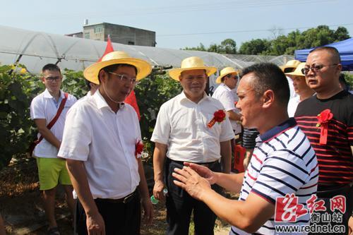 图为:市、县领导考察富利园葡萄基地。7月15日,中国衡山2017(第四届)乡村生态旅游节暨第四届白果黑提旅游文化节在白果镇富利园葡萄基地举行,上千名游客在此“品白果黑提、游名人故居,吃农家土菜”。市旅游外侨民宗局局长向前宣布活动开幕,县委副书记、县长蒋青致辞。蒋青在讲话中指出,近年来,县委、县政府高...