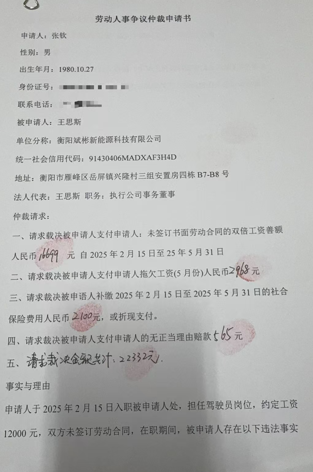 被申请人:衡阳斌彬新能源科技有限公司(法定代表人:王思斯)本委已受理申请人张钦诉你单位劳动争议一案(雁劳人仲案字〔2025〕第110号),2025年9月9日,本委通过邮政ems邮寄仲裁申请书副本、应诉及开庭相关文书被退回。因无法与你单位取得联系,现依法向你单位公告送达申请书副本、应诉通知书及开庭通知...