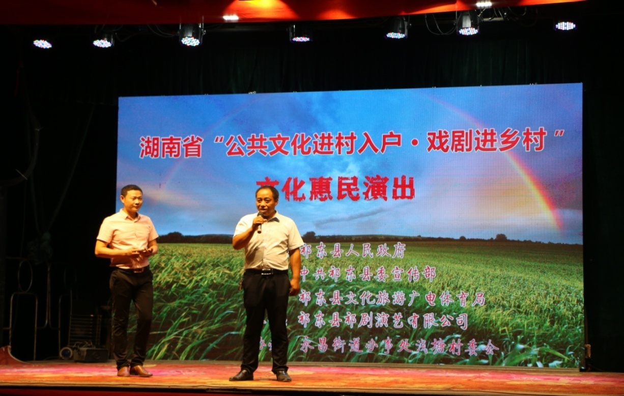祁东县祁剧演艺有限责任公司开展湖南省"公共文化进村入户戏剧进乡村"文化惠民演出活动第二场祁东祁剧演艺有限责任公司文化惠民,送戏下乡活动8月30日来到了永昌街道浅塘村。村支书上台致词。新编现代禁毒小戏《溺爱的毒》。