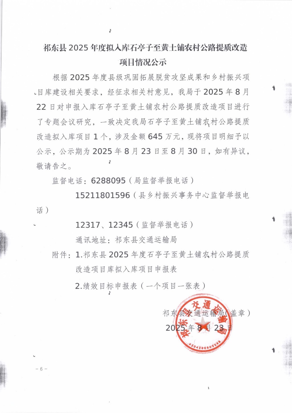 我县x003线洪桥至金桥公路于2025年5月16日已开工建设,经县人民政府批准,洪桥至金桥改造工程实行交通封闭,现将有关事项通告如下:一、封闭时间:2025年6月6日至2025年9月29日。二、封闭期间绕行路线:由鸟江经金桥往县城方向的车辆经鸟丁线上连接线,反之经连接线下鸟丁线;
