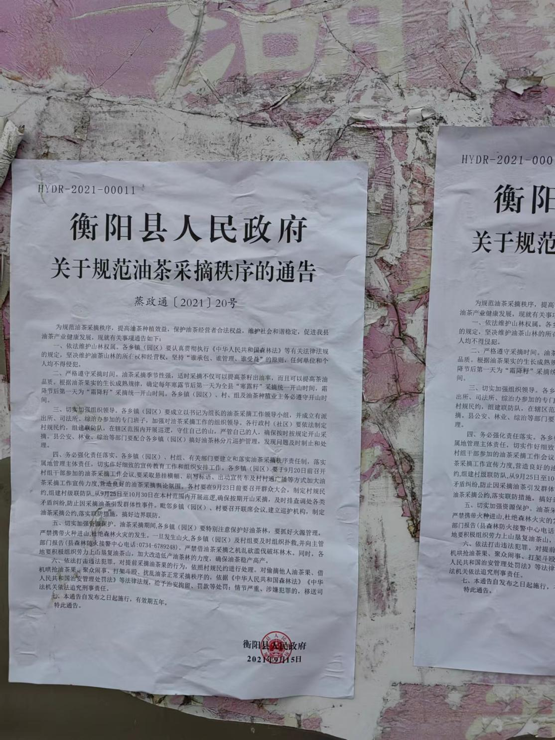 • 衡阳县为规范油茶采摘秩序,印发油茶采摘秩序通告以保障采摘工作规范、有序、高效开展,提升油茶种植效益。9月25日,《通告》同步在衡阳县政府官网发布,通告明确要求依法维护山林权属,任何单位或个人均不得侵犯。严格遵守采摘时间,根据油茶果实的生长成熟规律,确定每年寒露节后第一天为全“寒露籽”采摘统一开山时...
