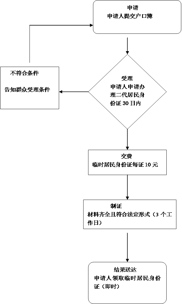 • 环节顺序环节名称办理人员办理时限审查标准审查结果首环节受理受理人员即时申请办理居民身份证30日内符合条,受理不符合条,不予受理第二环节交费收费人员即时临时居民身份证10元打印受理凭条第三环节制受理人员3个工作日申请办理居民身份证30日内符合条,受理不符合条,不予受理尾环节结果送达受理点...