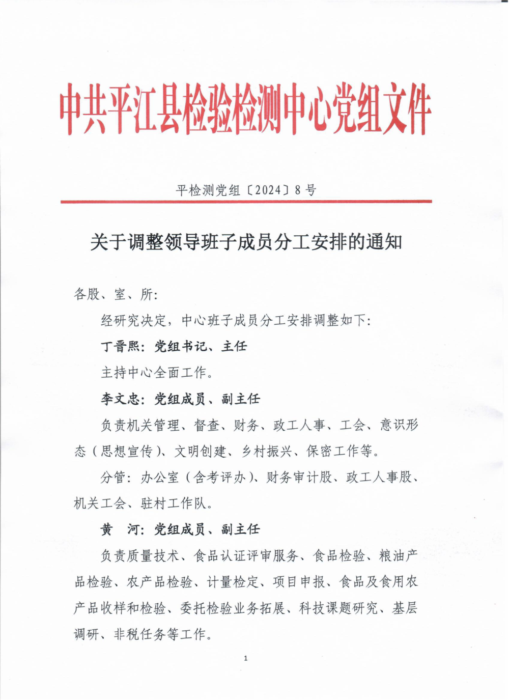 关于2017年领导班子成员分工安排的通知各部室:现将2017年公司领导班子成员分工安排通知如下:中心党组书记、主任,公司董事长兼工建投公司董事长叶和阳:主持全面工作。中心党组成员、副主任,公司总经理湛解军:协管全面工作,分管机关、财经、融资工作。联系办公室、财务部、融资部。中心党组成员、副主任,公司...