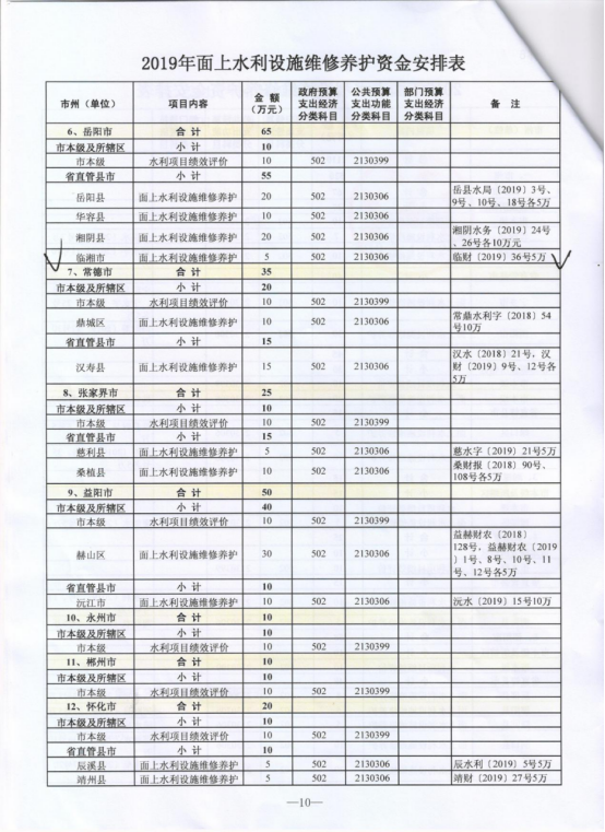 湖南省财政厅关于下达省水利厅2019年第二批部门预算资金的通知