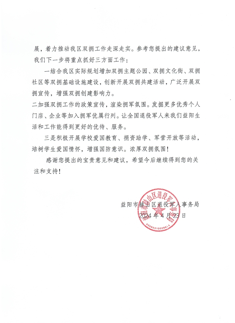 • 关于对益阳市政协七届三次会议张谭生委员第0016号提案的答复尊敬的张谭生委员:您提出的《关于打造双拥示范街区的建议》的提案收悉,感谢您一直以来对双拥工作的支持,我局高度重视,认真组织研究,现答复如下:一、关于“打造一个双拥文圈”的建议区政府、区人武部领导一直高度重视双拥创建工作,以双拥模城创建为...
