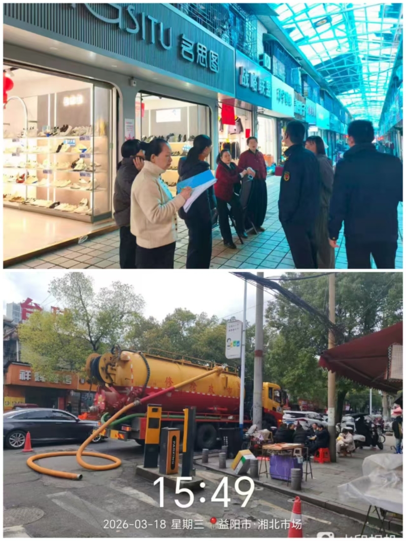 组织力量集中清理背街小巷积存垃圾,对下水管网及公厕进行吸污疏通,解决淤堵顽疾。4、协同联动,优化施工方案。与湘北改造施工方开展现场联合勘察,科学调整施工计划,减少对商户经营的影响。下一步,湘北市场管理办公室将持续巩固整治成果,建立长效管理机制,确保市场安全、有序、整洁、规范运行。