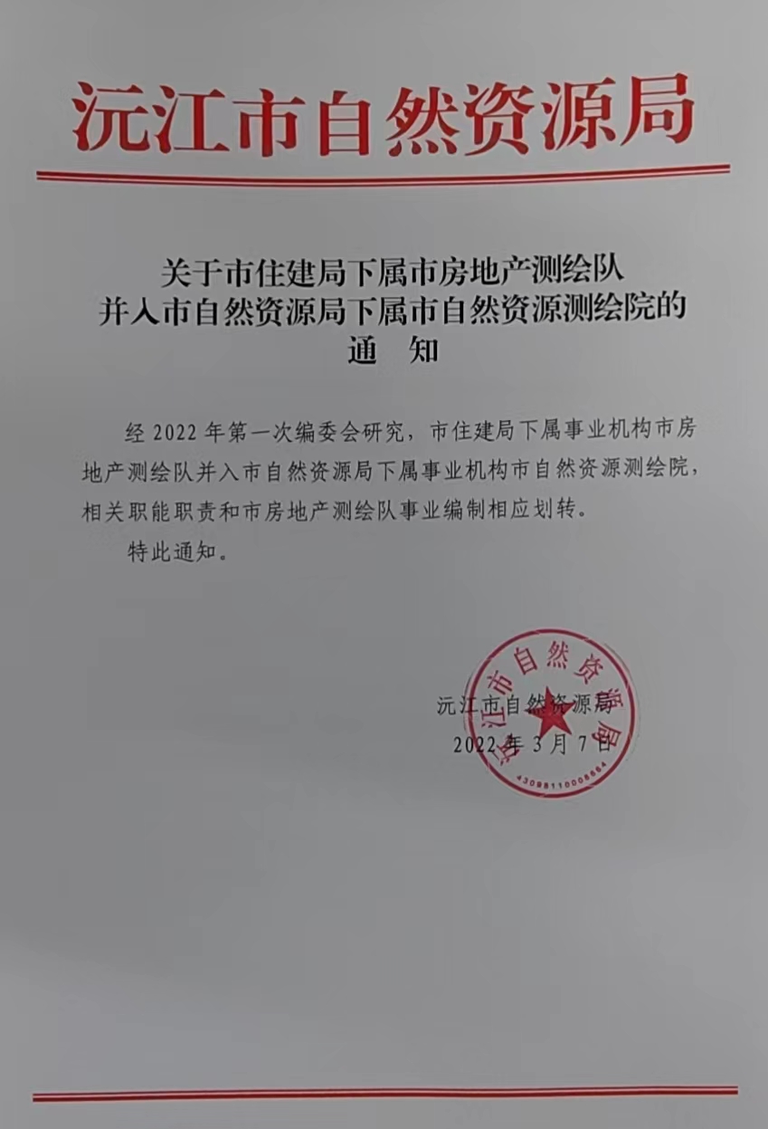 经2022年第一次编委会研究,市住建局下属事业机构市房地产测绘队并入市自然资源局下属事业机构市自然资源测绘院,相关职能职责和市房地产测绘队事业编制相应划转。特此通知。沅江市自然资源局2022年3月7日