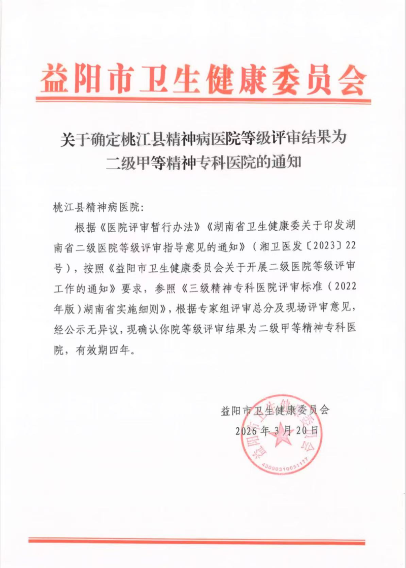 近日,益阳市卫生健康委员会发布医院等级评审结果公示,桃江县精神病医院成功获评二级甲等精神专科医院,标志着医院综合服务能力与精细化管理水平实现质的飞跃,为健康桃江建设注入强劲动力。为顺利通过等级评审,医院党支部高度重视、靠前指挥,专门成立工作专班,严格对照评审标准细化任务、压实责任。与此同时,医院通过...