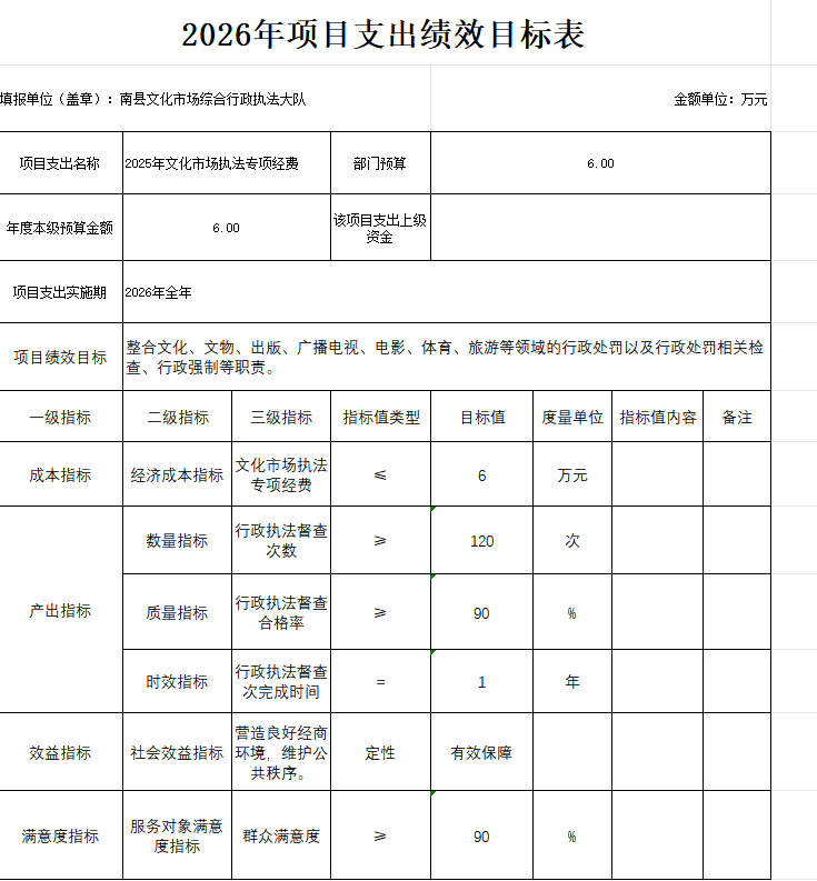 填报单位(盖章):中共南县县委党校金额单位:万元项目支出名称干部培训费部门预算24.00年度本级预算金额24.00该项目支出上级资金项目支出实施期2026年度项目绩效目标组织好全县干部培训,提高全县干部政治素质。一级指标二级指标三级指标指标值类型目标值度量单位指标值内容备注成本指标经济成本指标干部培...