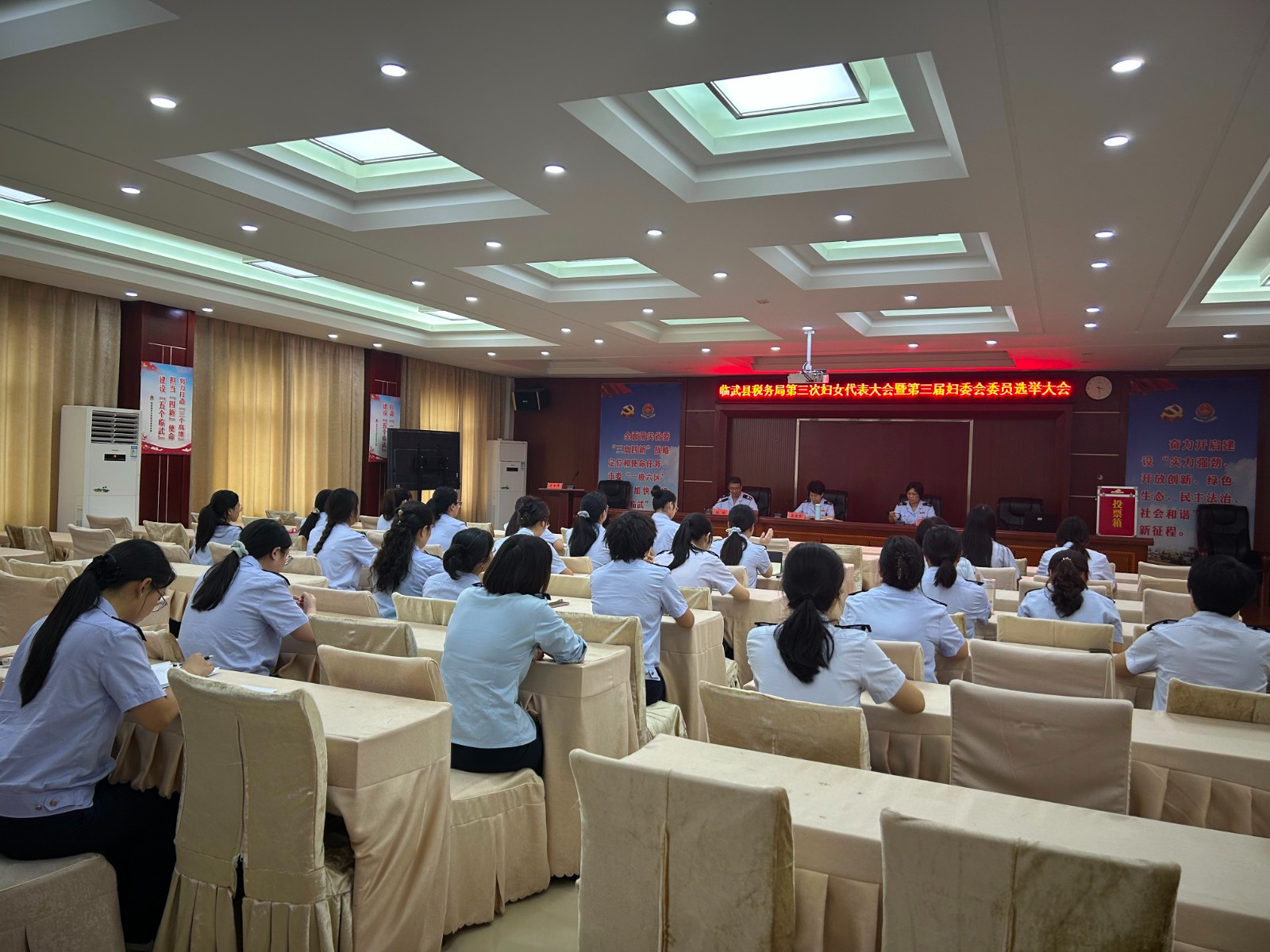 9月4日,国家税务总局临武县税务局召开第三次妇女代表大会暨第三届妇委会委员选举大会。会上,该局妇女代表齐聚一堂,以无记名投票的形式差额选举产生新一届妇女委员会,新当选的妇委会主任代表新一届委员会作表态发言。会上,该局党委书记对新一届妇委会提出殷切希望:要当好“引路人”,注重自身建设,强化思想政治引领...