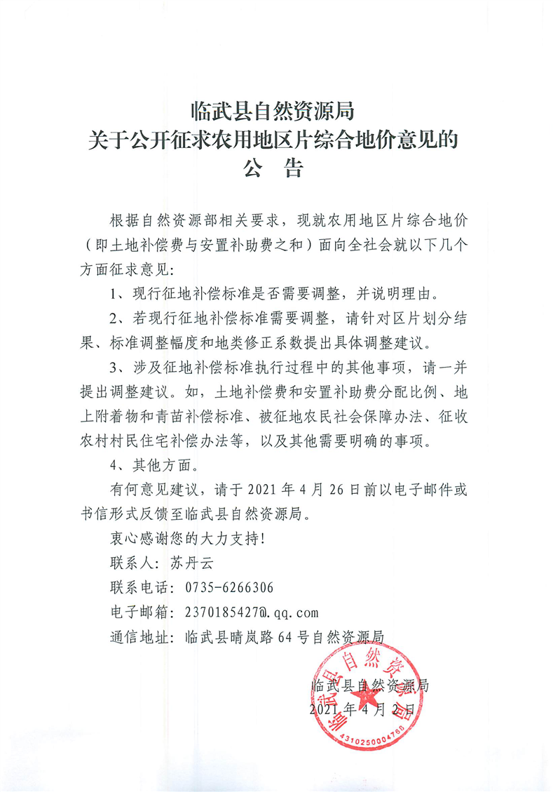 临武县人民政府关于实施集体建设用地基准地价和农用地基准地价评估成果的公告各乡镇人民政府,县政府各部门、直属事业单位,省市驻临各单位:根据《湖南省自然资源厅办公室关于转发〈自然资源部办公厅关于部署开展2019年度自然资源评价评估工作的通知〉的通知》(湘自资办发〔2019〕77号)、《关于进一步做好湖南...