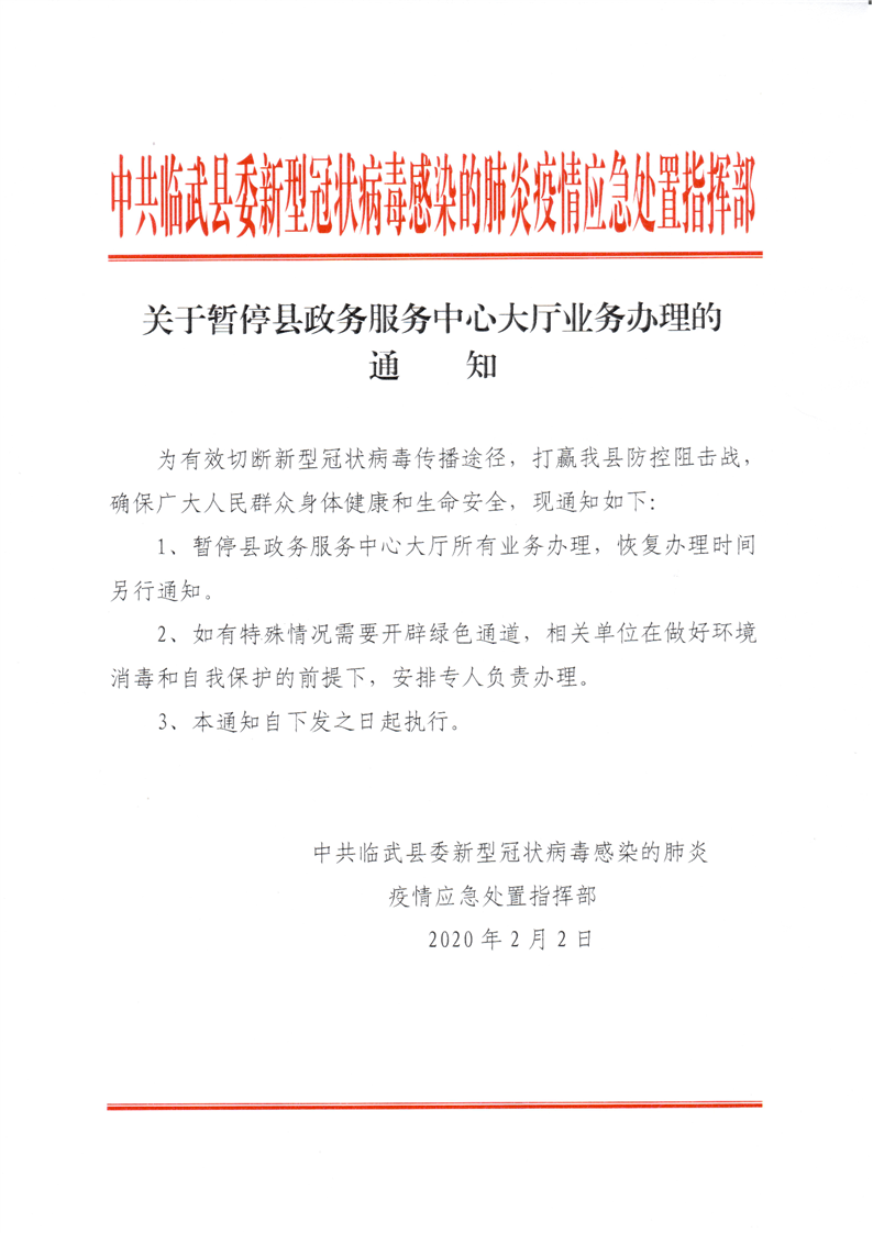 亲爱的市民朋友:为有效切断新型冠状病毒传播途径,打赢我县疫情防控阻击战,确保广大人民群众身体健康和生命安全,根据《中共临武县委新型冠状病毒感染的肺炎疫情联应急处置指挥部关于暂停县政务服务中心大厅业务办理的通知》要求,现公告如下:1.暂停县政务服务中心大厅所有业务办理,恢复办理时间另行通知。2.建议与...