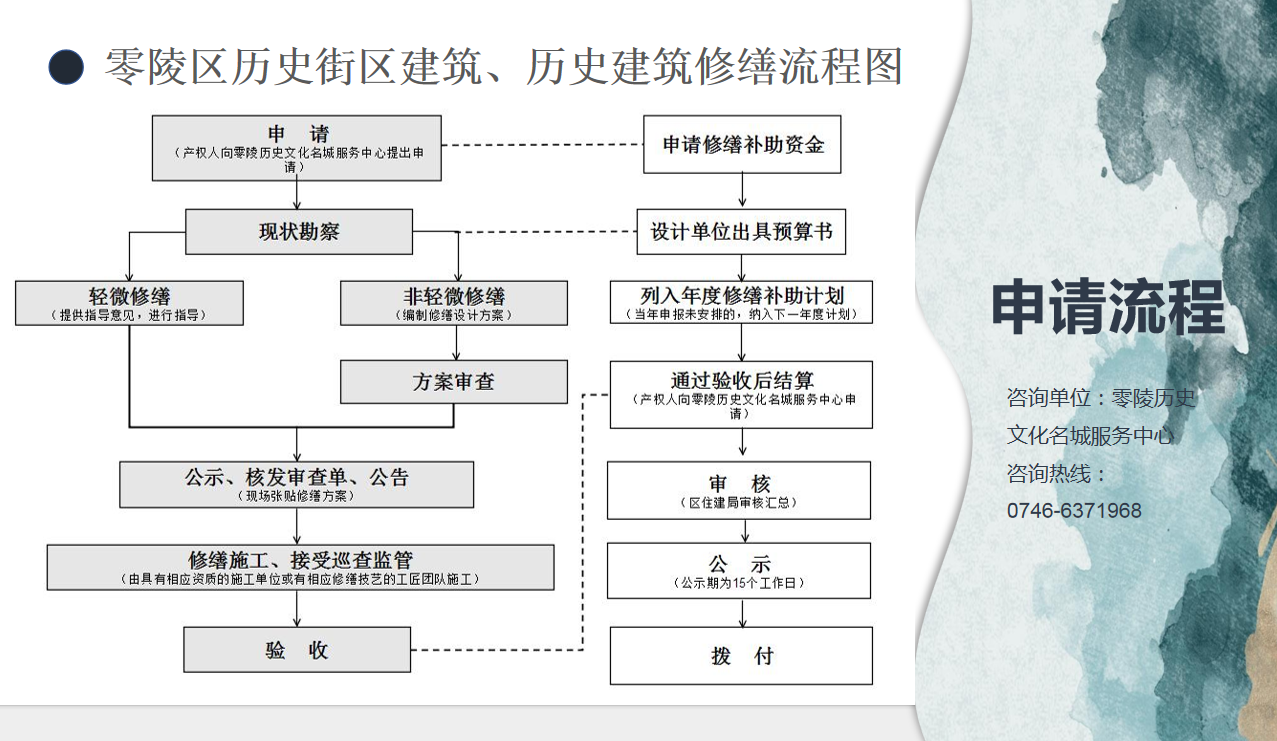 三、主要内容该实施方案明确了适用范围、申请条件、工作流程、工作要求,规范审查程序,建立多部门联合审查机制,提升服务效能。(一)适用范围零陵区柳子街、大西门、正大街-城南路三条历史文化街区(含核心保护范围和建设控制地带)内的建筑,以及其他区域纳入历史建筑名录或历史建筑潜在对象名录的建筑修缮。(二)申请...