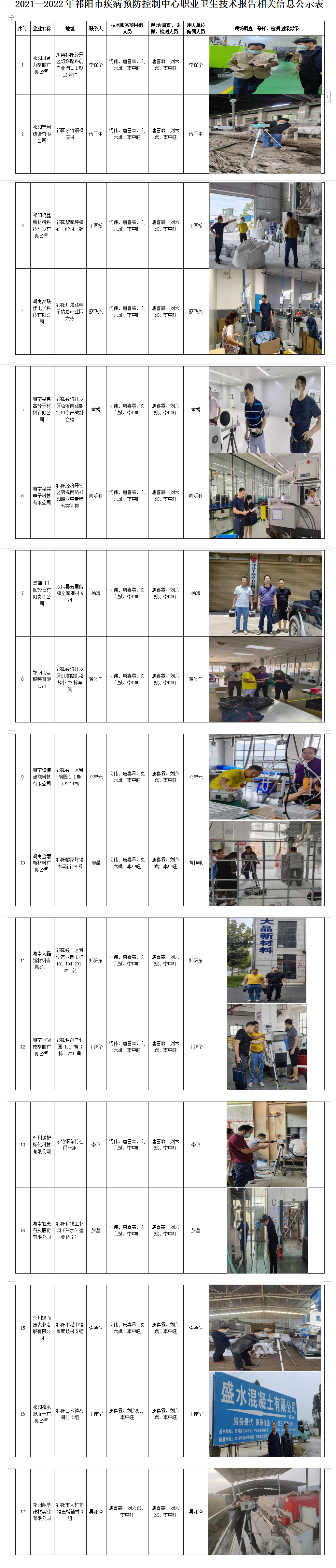 根据《中华人民共和国职业病防治法》的要求,2021—2022年祁阳市17家企业委托祁阳市疾控中心开展职业病危害因素监测,通过现场调查、现场采样、现场检测,依据《职业卫生技术服务机构管理办法》第三十一条规定,现将2021—2022年职业卫生技术报告相关信息公示。
