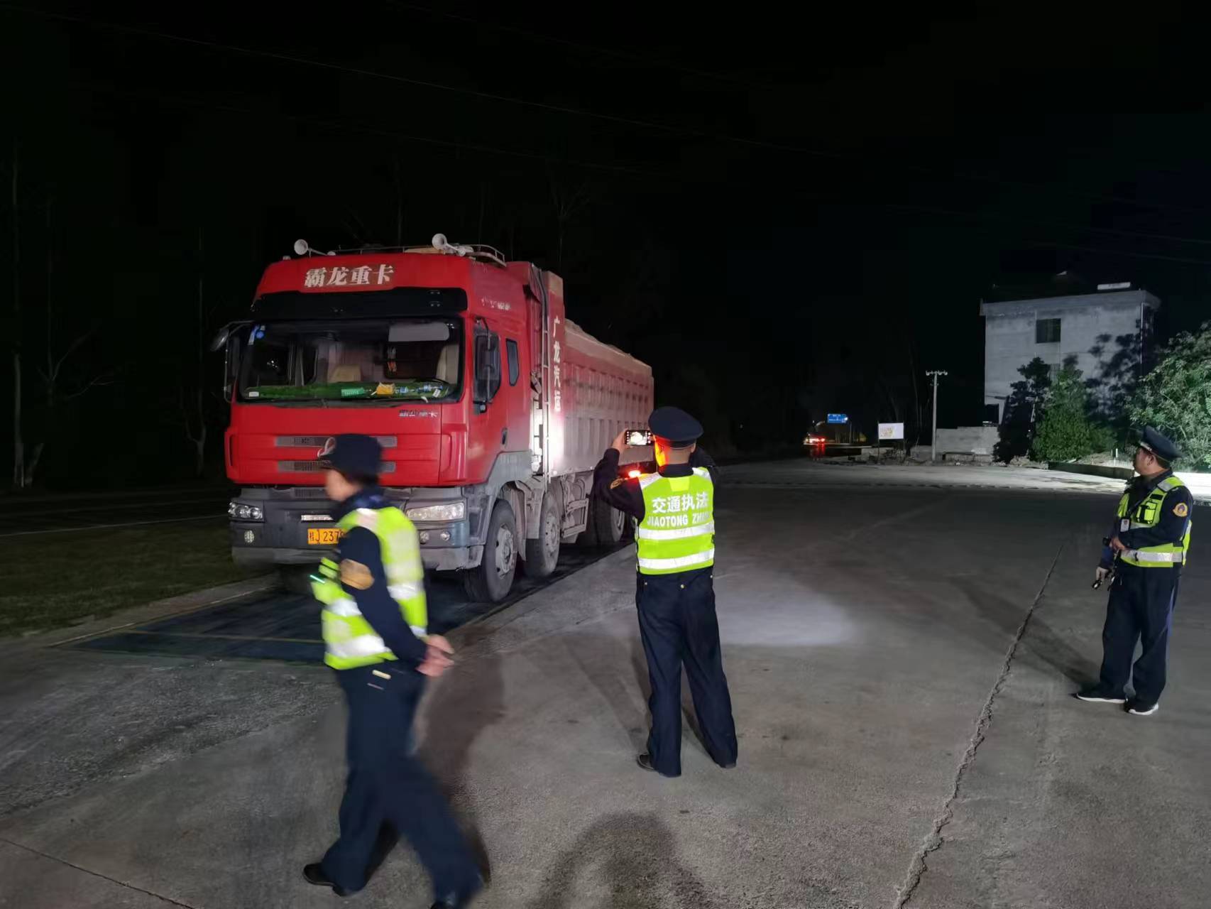 深夜10点多钟,当他们一行路巡到比较偏远的江华县河路口镇通往广西富川县的一条道路时,突然迎面遭遇5台货车,执法人员把它们全部拦截下来,一一详细检查。经检查,为了尽量多装货,这些车辆不顾安全,货箱都非法加高栏板30多公分,其中1台车辆还存在超限超载行为。