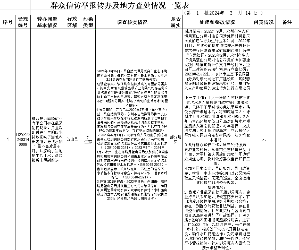 督察组指出,作为湘江源头地区,蓝山县委、县政府高度重视生态环保工作,在环境保护和治理方面做了大量工作,取得的成绩值得充分肯定。督察组强调,要进一步重视生态环境保护和治理工作,特别是对中央环保督查组交办案件的查处整改工作,务必按照“零容忍、全覆盖、严执法”的要求,切实抓实抓细抓出成效;对辖区内查处属实...
