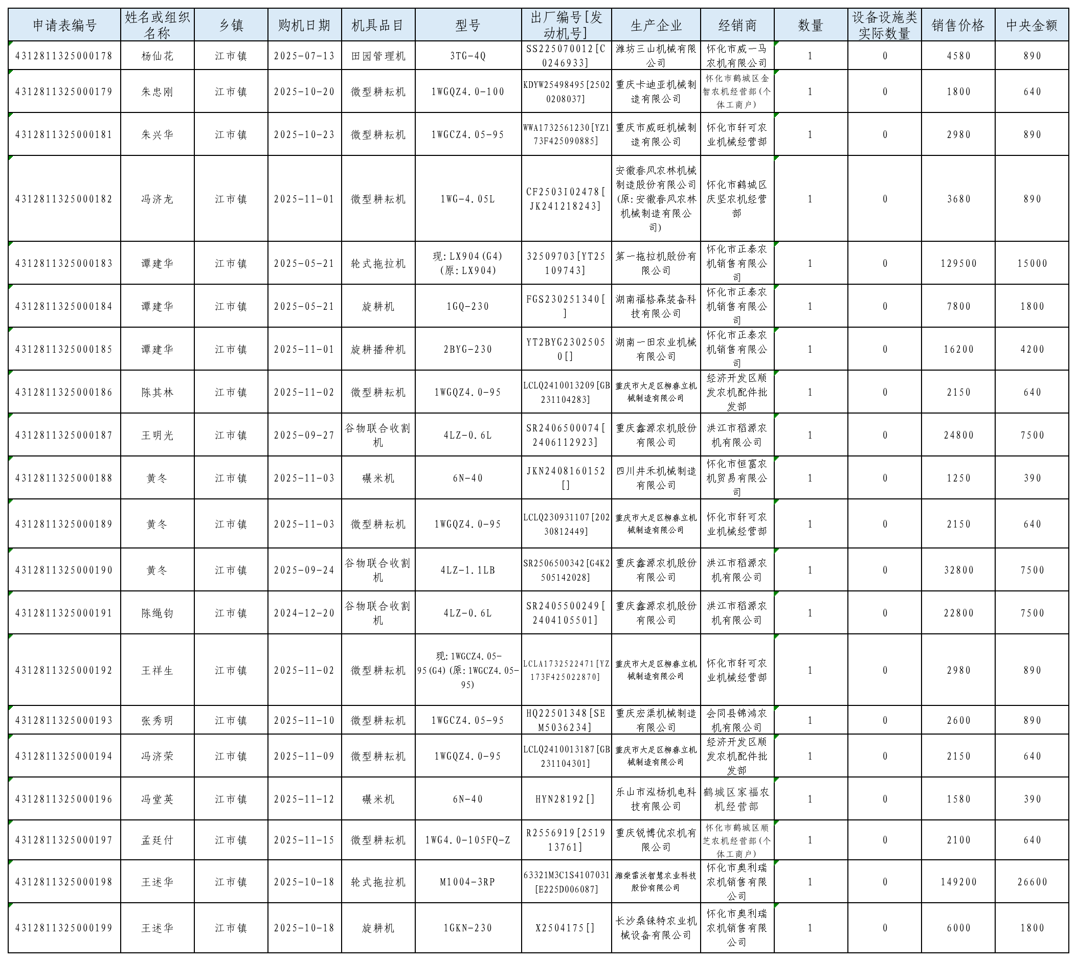 根据《湖南省2024-2026年农业机械购置与应用补贴实施方案》要求,经购机者自主申请,乡(镇)审核,农机部门抽样核查,2025年中方县第七批农机购置补贴机具48台(套)受益户48户,中央补贴资金4.484万元,共计4.484万元,现予以公示。附:中方县2025年第七批农机购置补贴资金发放明细