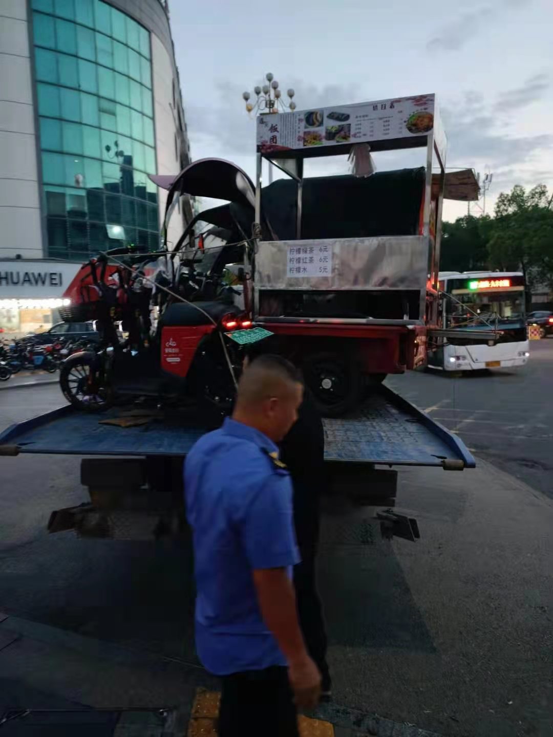 针对怀化学院东、西校区投诉严重,且小摊小贩屡劝不止的情况,怀化市鹤城区城市管理和综合执法局坨院执法大队专门展开市容整治行动。此次行动联合车管中队,共计出动30余执法队员,执法车辆5辆,拖车3辆,重点对两校区周边影响市容环境卫生及道路交通安全的摊贩进行了车辆和物品的暂扣,暂扣三轮车15台,推车5辆。