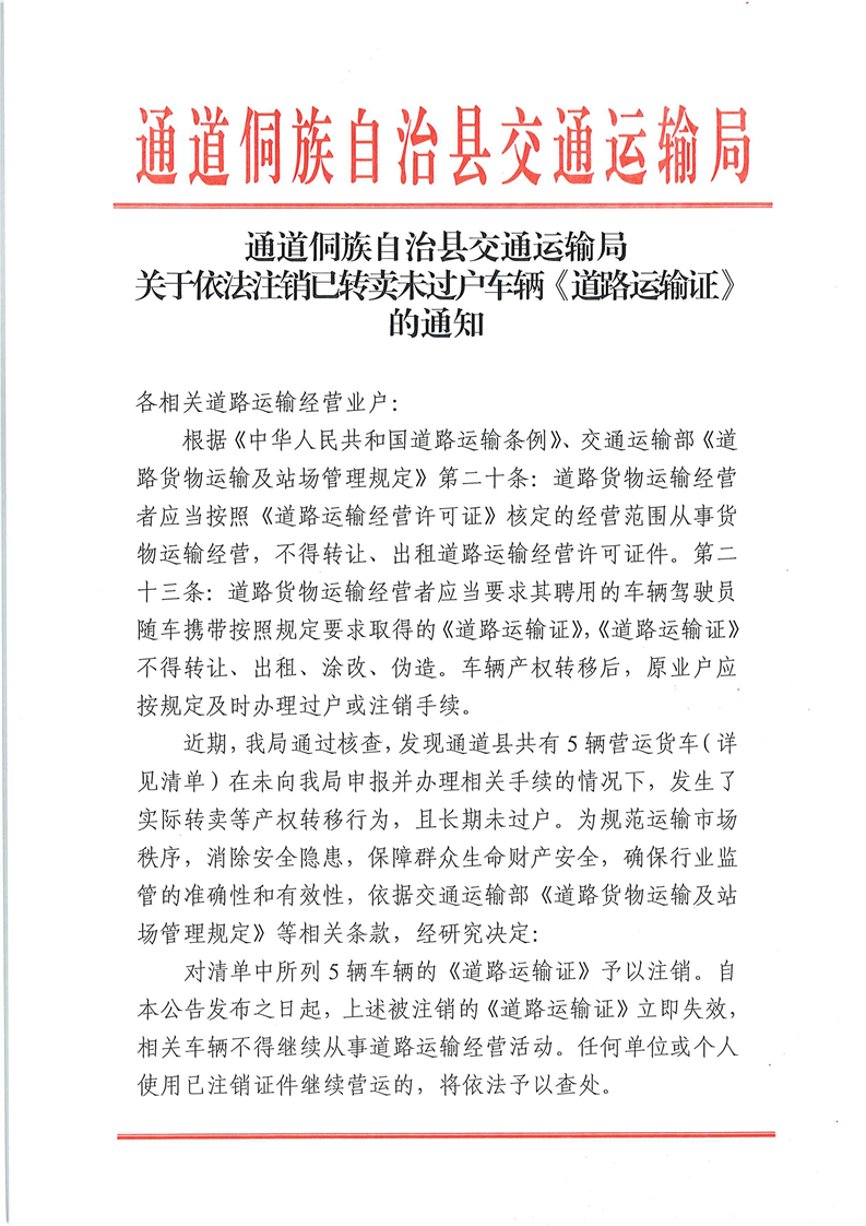 根据《中华人民共和国行政许可法》第六十九条第(五)款、第七十条第(六)款,以及《网络预约出租汽车经营服务管理暂行办法》等规定,经企业公告并申请,现将以下网络预约出租汽车《道路运输证》予以注销(名单见附件)。自本公告公布之日起七日内,如有疑问请联系怀化市道路运输服务中心,联系电话:0745--2712...