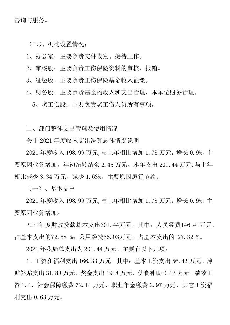 一、部门职责及机构设置情况(一)部门职责主要职责是为工伤保险提供管理与服务,工伤保险基金预算、征缴、管理、支付及办理工伤保险登记、审核、工伤保险的调查、统计、信息管理、咨询与服务。(二)机构设置情况1、办公室:主要负责文件收发保存、接待工作。2、审核股:主要负责工伤保险待遇审核工作。3、征缴股:主要...