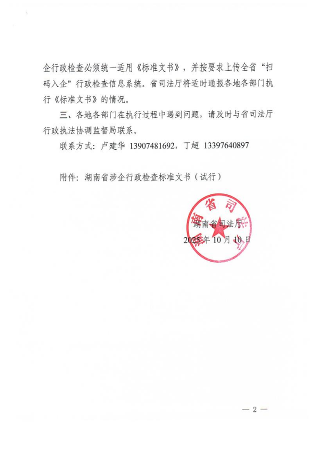 关于统一适用《湖南省涉企行政检查标准文书(试行)》的工作提示(第四期) 各乡(镇)人民政府、县直行政执法机关:为严格规范涉企行政检查,10月10日省司法厅制定了《湖南省涉企行政检查标准文书(试行)》,请所有行政执法单位于10月20日起统一适用《标准文书》,并按要求上传“扫码入企...