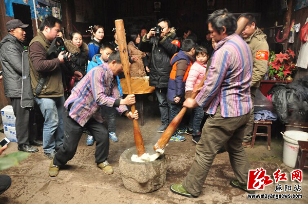 1月26,腊月17,离过年只有12天,大桥江乡豪侠坪村举办麻阳年传统文化节,近千群众欢聚一堂:杀年猪,打糍粑,跳花灯,耍绝技,赏傩戏。游客们进入豪侠坪村村民、游客、摄影爱好者们一起欣赏麻阳传统戏曲——花灯戏飙桌子表演钻火圈写春联打糍粑