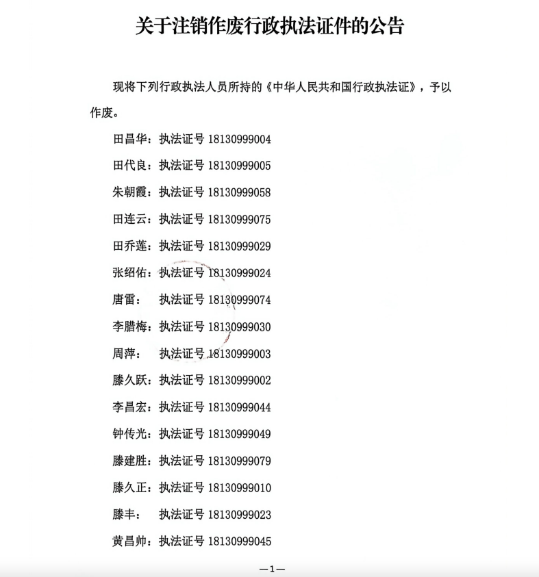 为全面加强行政执法证件管理,根据怀化市人民政府行政执法协调监督办公室《关于开展行政执法证件专项清理工作的通知》要求,决定对以下行政执法证予以注销:序号姓名执法证号清理原因公示原因1滕丹18130930016单位调动注销2胡铁18130930096单位调动注销3周候帅18130930037单位调动注销...