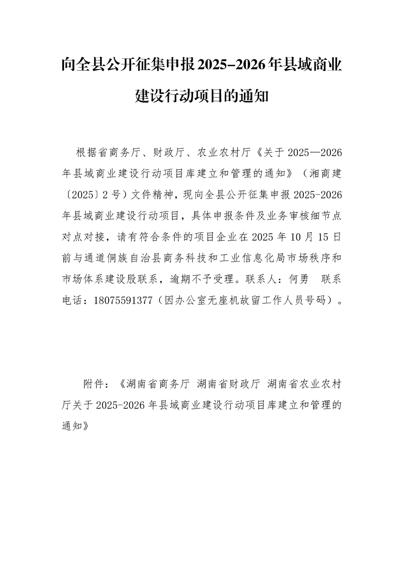 芷江侗族自治县关于公开征集申报2025—2026年县域商业建设行动项目的通知 根据省商务厅、财政厅、农业农村厅《关于2025—2026年县域商业建设行动项目库建立和管理的通知》(湘商建〔2025〕2号)文件精神。经芷江侗族自治县商科工信局党组研究决定,现向全县各商贸流通企业公开征集申报20...