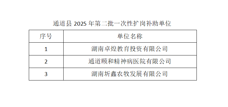如对公示单位享受一次性扩岗补助有异议,请与县就业服务中心失业保险部联系。 联系电话:0745-7846512 通道县2025年第三批一次性扩岗补助单位序号单位名称1通道侗族自治县盛鼎农村产权交易服务有限公司