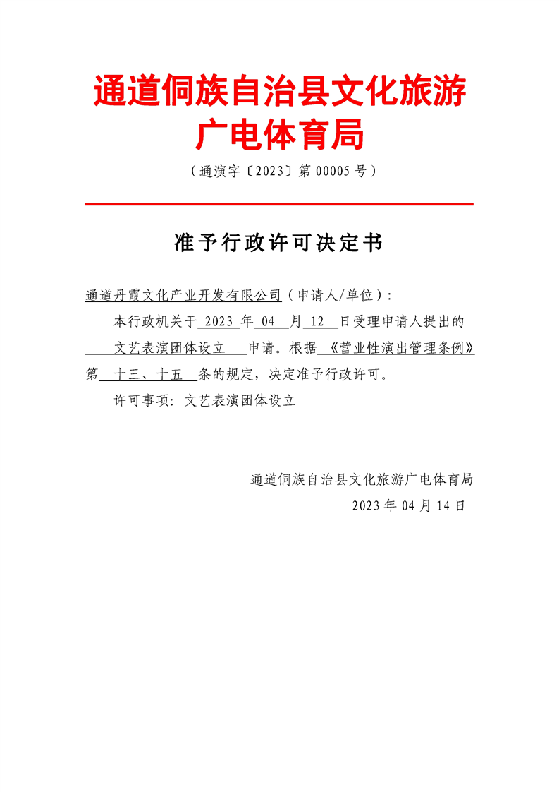 通道侗族自治县营业性演出准予许可决定 43123051202100002 许可/备案事项内地演出活动申请举办演出名称让世界侗听 湘桂黔三省侗族歌星演艺盛典举办单位/个人通道侗族自治县萨岁...