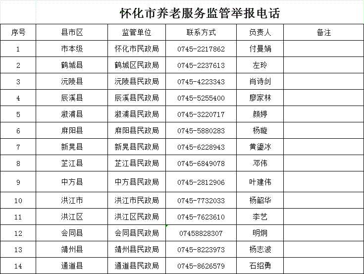 序号养老机构名称负责人地址1中方县社会福利院(中方县光荣院)叶建伟中方县生态城2花桥镇中心敬老院金吉良泸阳镇桥上村付角溪组3新路河镇中心敬老院蒲升炜新路河镇成渡江村唐家堰组4铜鼎镇中心敬老院陈爱华铜鼎镇铜鼎村鱼头湾组
