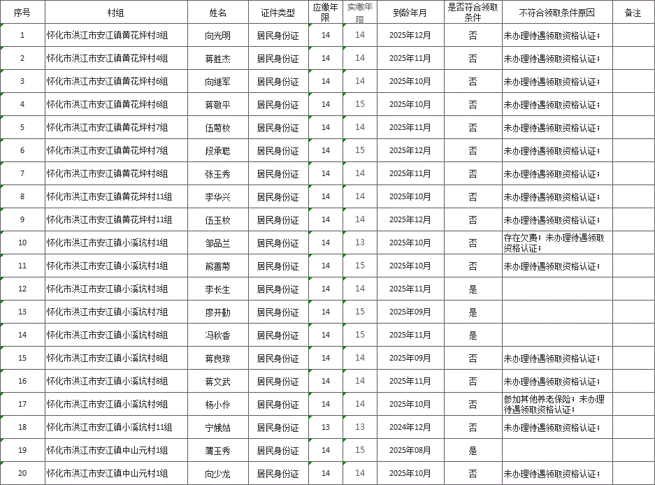 序号村组姓名应缴年限实缴年限到龄年月是否符合领取条件不符合领取条件原因备注1怀化市洪江市群峰乡杨柳村毛垅田组杨美琼14142025年11月是2怀化市洪江市群峰乡杨柳村毛垅田组杨丽妹14142025年09月是3怀化市洪江市群峰乡杨柳村毛垅田组易传香1382024年12月否存在欠费;未办理待遇领取资格认...