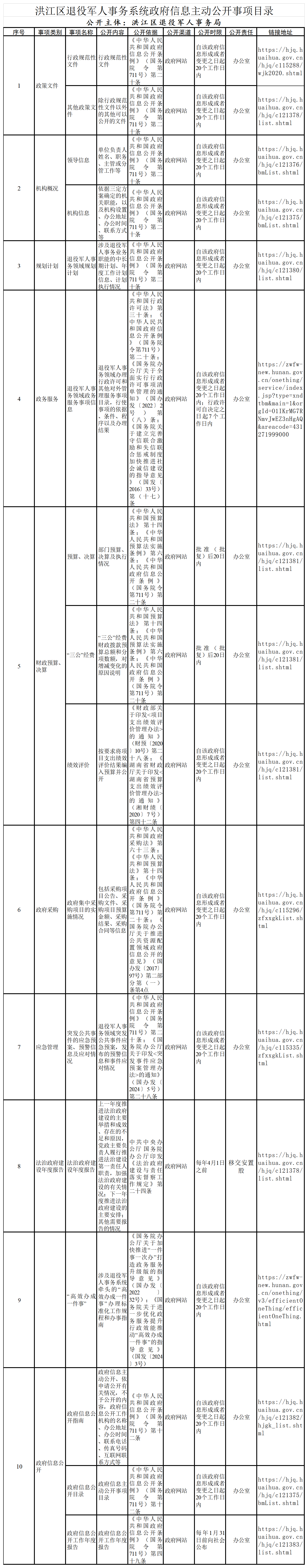 洪江区退役军人事务系统政府信息主动公开事项目录公开主体:洪江区退役军人事务局序号事项类别事项名称公开内容公开依据公开渠道公开时限公开责任链接地址1政策文件行政规范性文件行政规范性文件《中华人民共和国政府信息公开条例》(国务院令第711号)第二十条政府网站自该政府信息形成或者变更之日起20个工作日内办...
